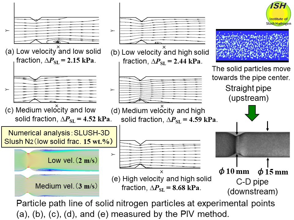 observation results [28]. The figure below shows the pressure drop ΔPSL for slush nitrogen and the particle path line for solid particles passing